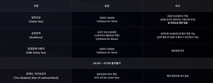 - 공연 관람객 할인: 최대 4시간까지 5,000원 (4시간 초과 시 일반 요금 적용)