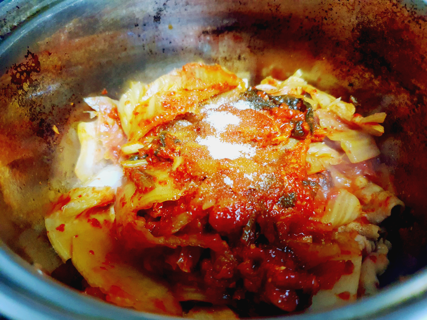 이제 김치가 투명해질 때까지 볶아준다. 밑에 깔린 재료들이 타지 않게 중간중간 섞어주기 필수!