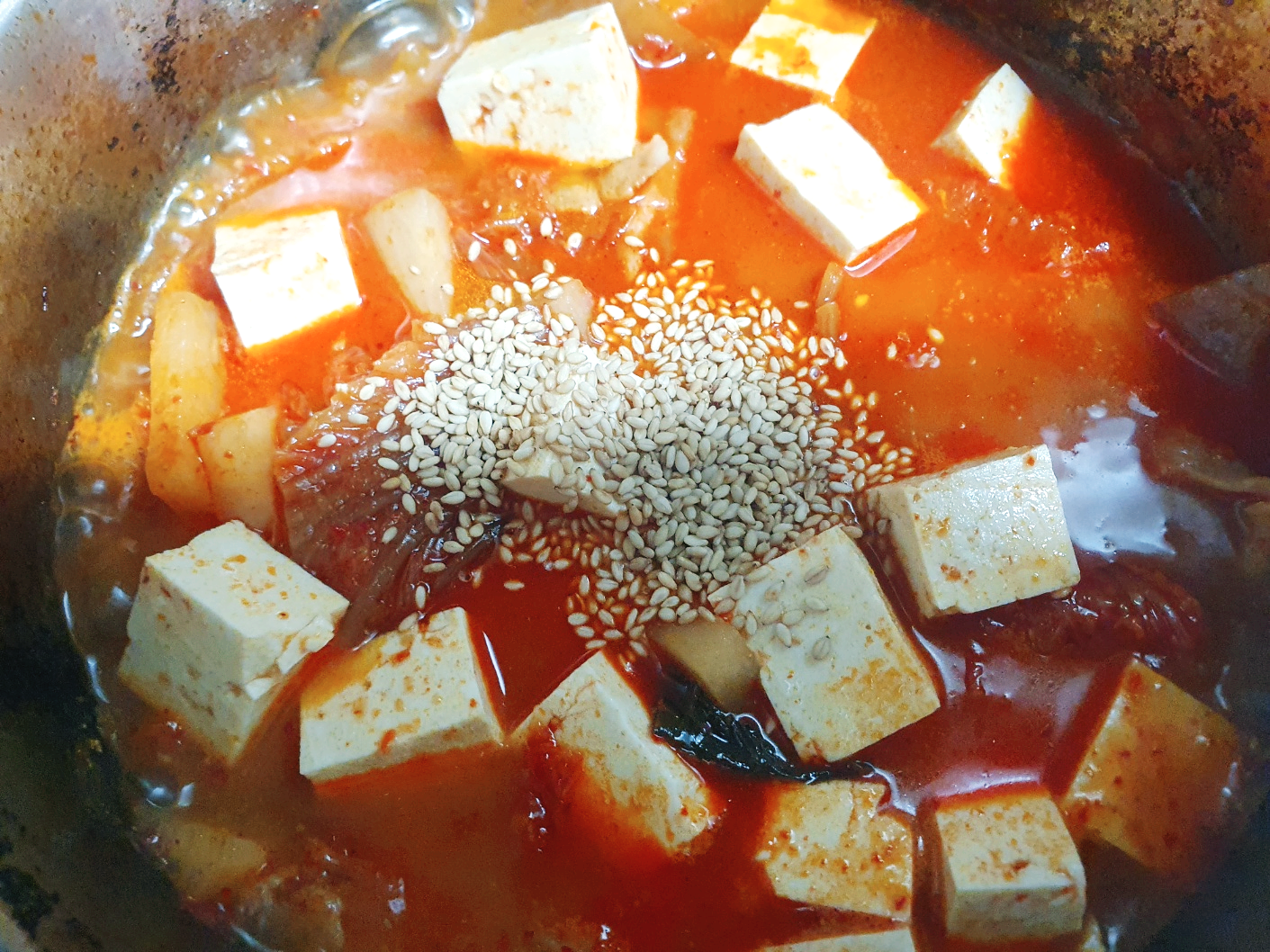 참기름을 투하하고 잘 저은 다음 손질해놓은 두부를 넣고 참깨로 마무리해준다.