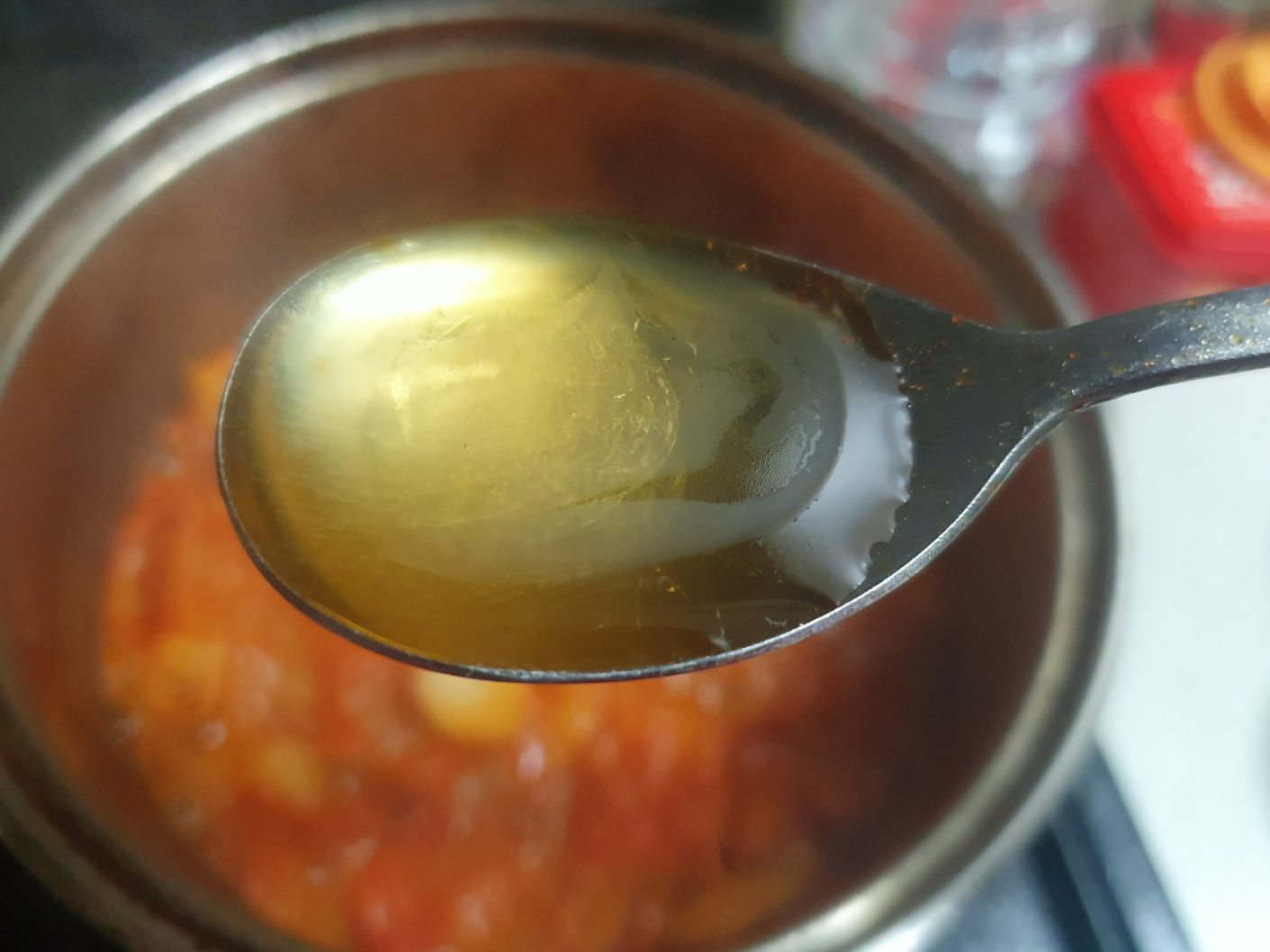 이제 김치찌개가 끓어오르면 맛을 보고 간을 한다.