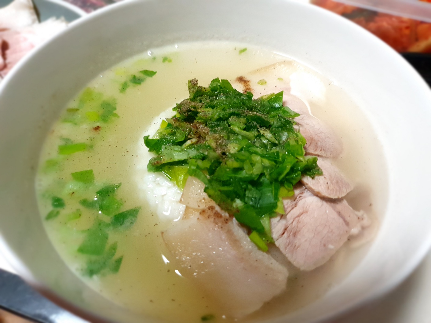수육이 올려진 밥 위에 육수를 붓고 잘게 손질한 파를 올린 후 그 위에 후추를 톡톡 뿌려준다.