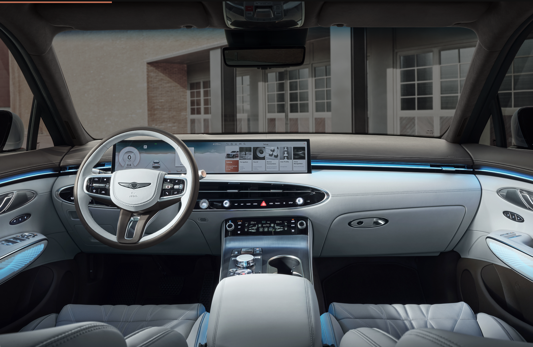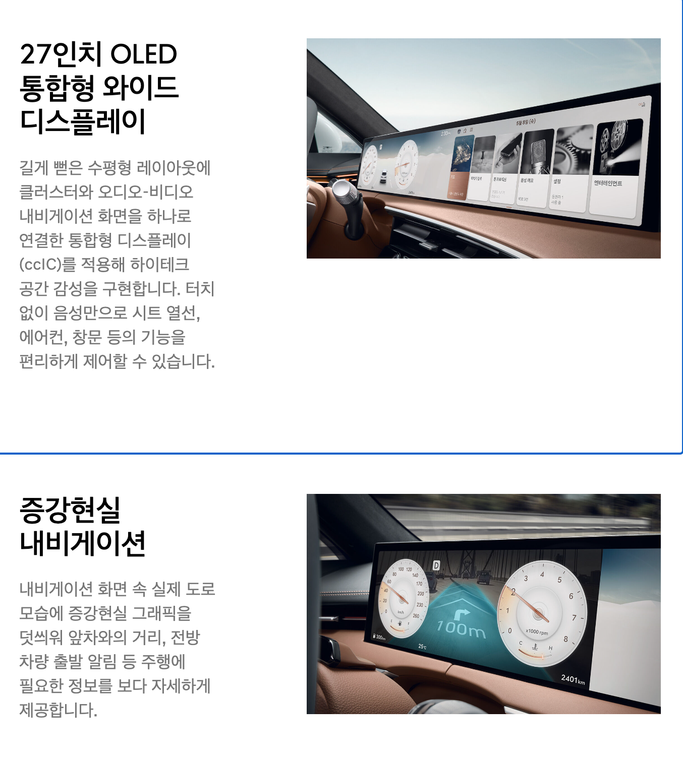 GV70의 실내는 운전자 중심의 대칭형 레이아웃을 통해 직관적이고 편안한 드라이빙을 제공하며, 27인치 와이드 디스플레이에서 펼쳐지는 증강현실 네비게이션은 필요한 정보를 음성만으로 제어하여 보다 안전한 드라이빙이 가능하도록 했습니다.