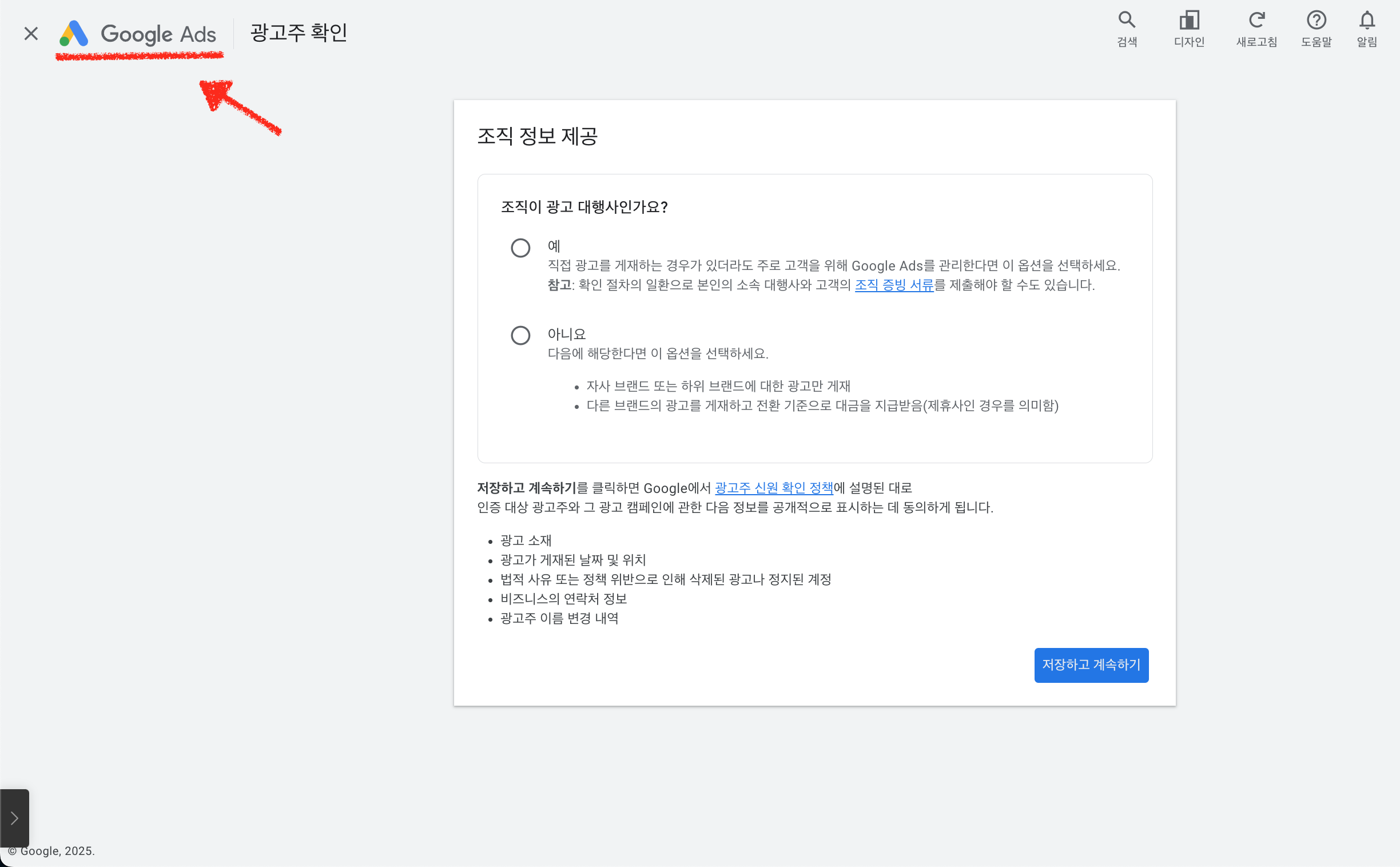 계속 버튼을 클릭하시고 나면 아래 화면이 나타나는데 모두 무시하시고 화살표로 표시된 Google Ads를 클릭 하시면 다음 화면이 나타납니다.