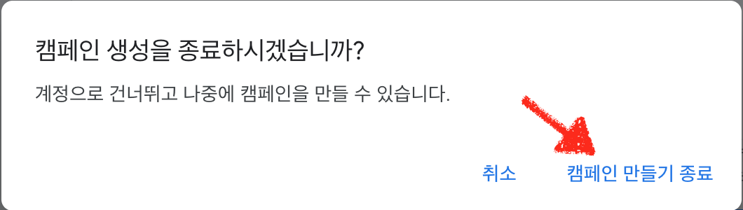모두 건너뛰기를 선택 하셨다면 캠패인 만들기 종료를 클릭해주세요.