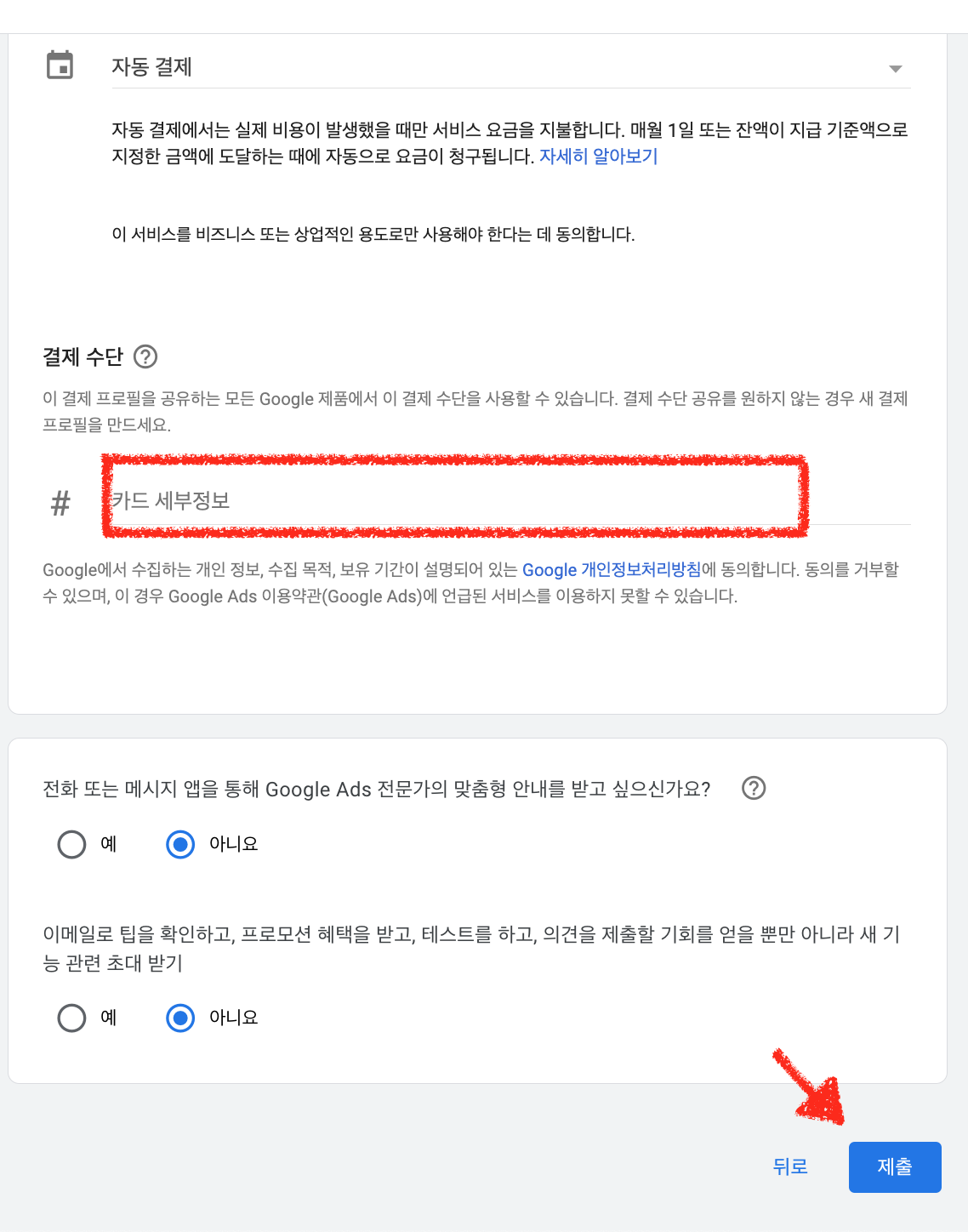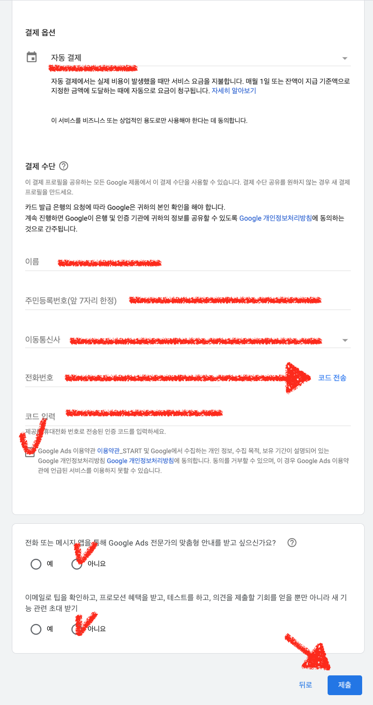 위 화면에 체크된 곳을 모두 기입 하고 화살표로 표시된 제출을 클릭합니다.