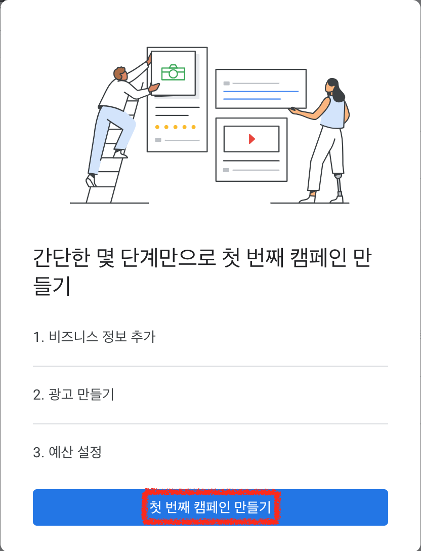 아래 사진에 표시된 새 Google Ads 계정을 클릭하시면 첫 번째 캠패인 만들기 화면이 나타납니다.