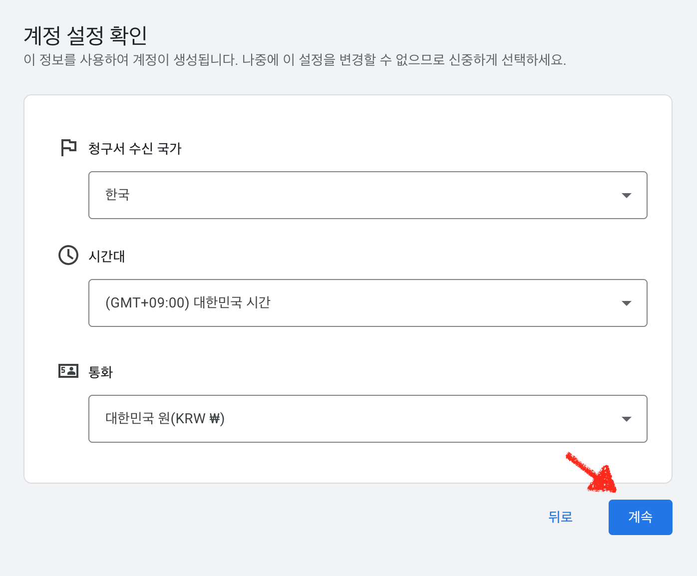 수고하셨습니다. 아래 표시된 계속 버튼을 클릭 하시면 구글 애즈 계정 생성이 완료 되신겁니다.