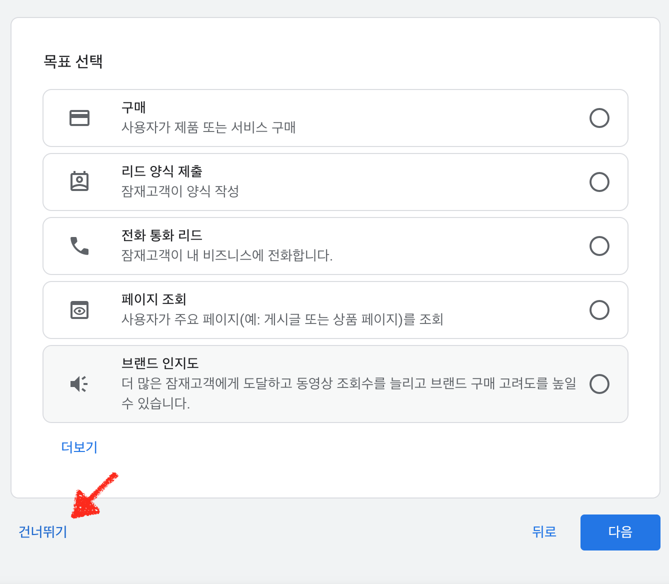 우리는 돈을 써서 광고 집행을 하지 않을 예정이기 때문에 모두 건너뛰기를 선택 하셔도 무방합니다.
