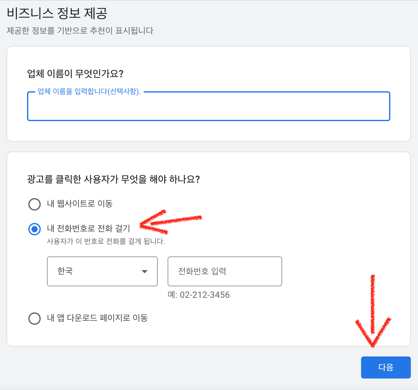 다음으로 아래 화면이 나타나면 업체 이름을 기입하고 내 전화번호로 전화걸기를 선택한 후 다음을 클릭합니다.