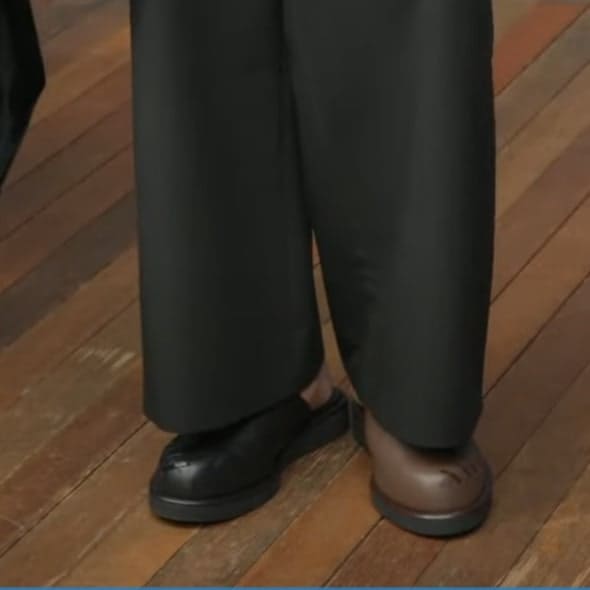두 번째는 더욱 혁신적인 구두 모양 슬리퍼입니다. 슬리퍼이지만 정장이나 세미 정장에도 자연스럽게 어울릴 수 있도록 구두의 형태를 본떠 디자인된 것이 특징입니다. 회사 출근이나 격식 있는 자리에서도 부담 없이 신을 수 있도록 기획되어, 멀리서 보면 영락없는 구두처럼 보일 정도로 세련된 외관을 자랑합니다.