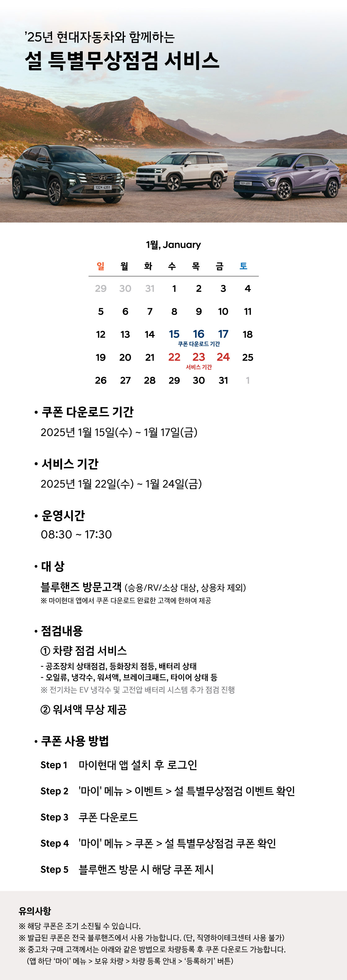 1월 22일부터 1월 24일까지 서비스를 진행한다고 합니다만 마이 현대 앱을 통해 쿠폰을 먼저 다운로드하여야 합니다.