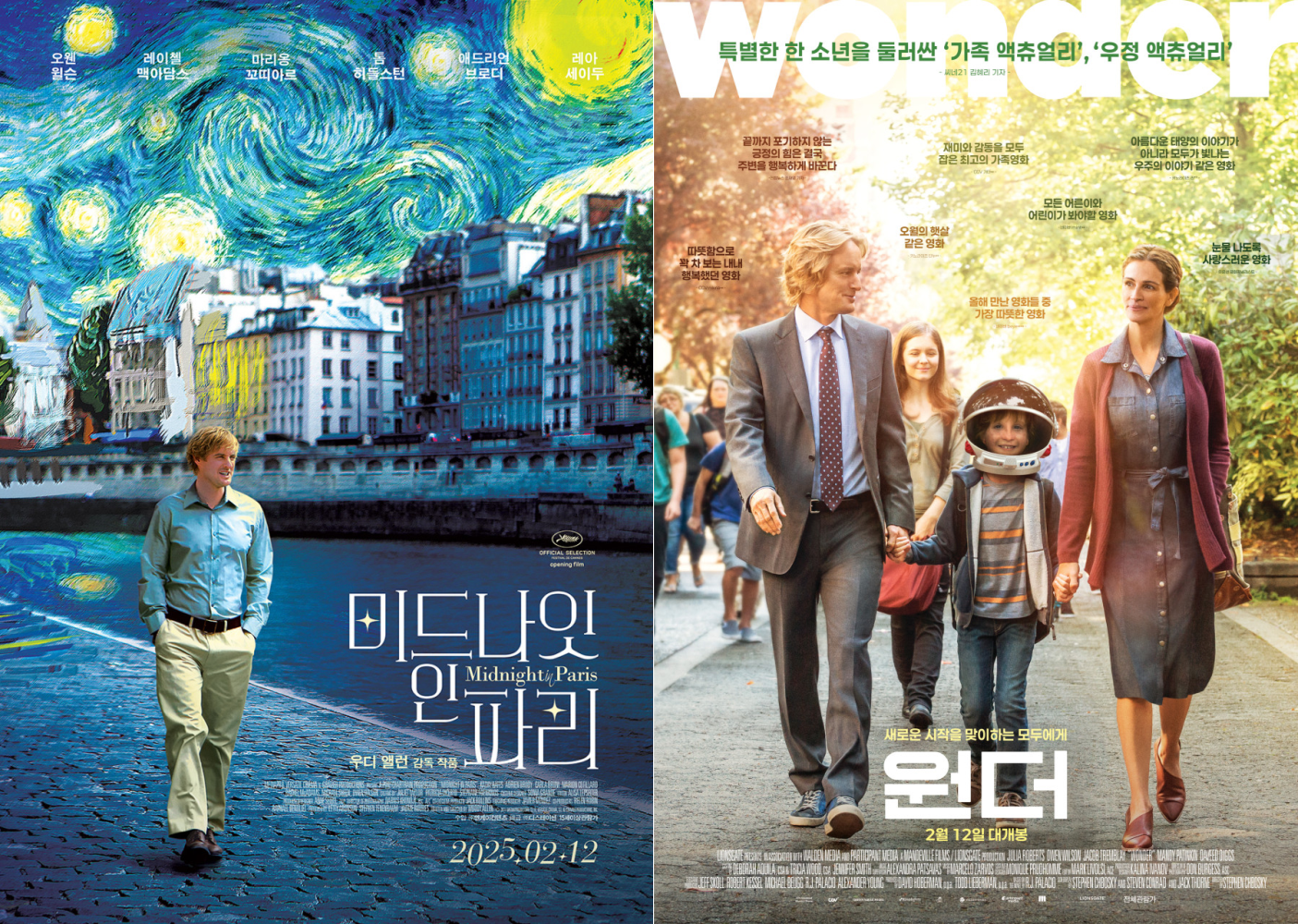 많은 영화 팬들의 인생 영화로 꼽히는 영화 두 편의 재개봉 소식이 있습니다. 영화 "원더"와 "미드나잇 인 파리"인데요. 두 작품은 2월 12일 재개봉을 예정하고 있으며, 눈에 띄는 점은 두 작품 모두 오웬 윌슨 주연의 영화라는 점이네요. 두 작품 모두 평점 9점대를 받을 만큼 좋은 영화로 평가를 받고 있으니 아직 관람하지 못하신 분들께선 이번 기회에 관람해 보시길 추천드립니다.