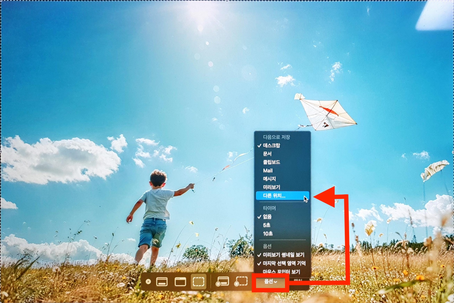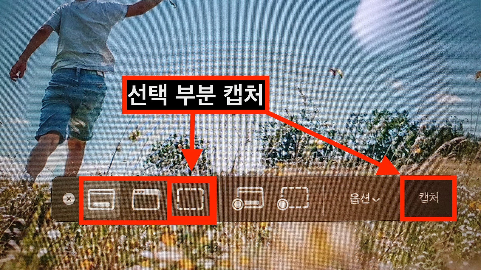 선택 부분 캡처를 이용하면 아래의 화면처럼 캡처가 진행됩니다. 예시로 이미지 속 아이가 날리고 있는 연을 부분 캡처해 보도록 하겠습니다.