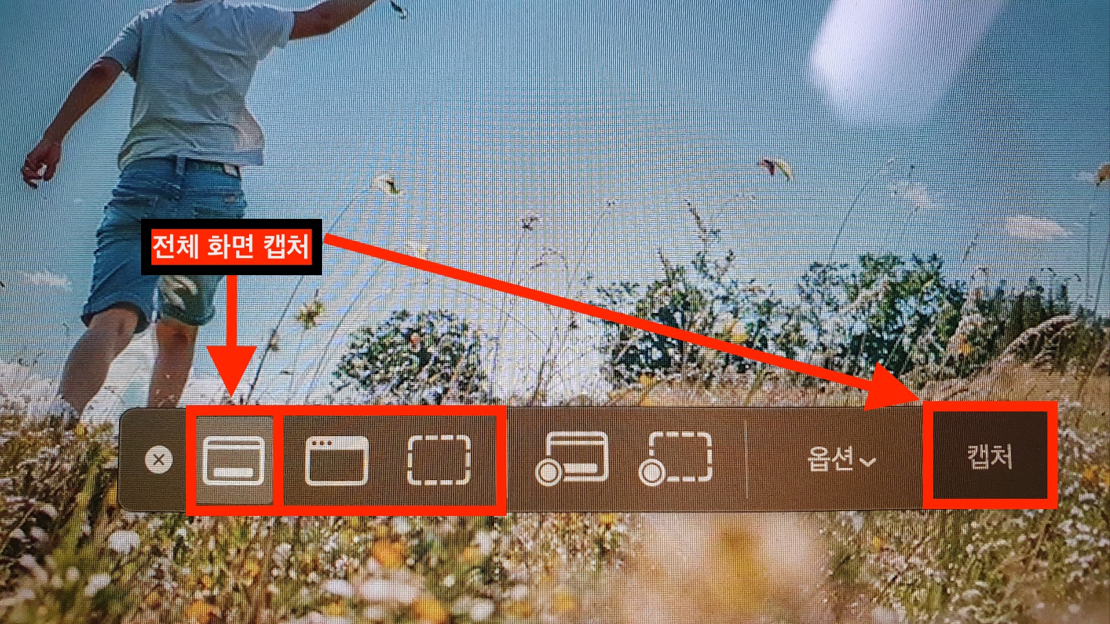 왼쪽 하단의 큰 네모 박스가 캡처 도구 박스입니다. 그중 표시된 첫 번째 박스가 컴퓨터 전체화면의 캡처입니다. 차례로 선택한 윈도 화면 캡처, 부분 캡처인데 두 사항은 아래에서 설명하도록 하고 첫 번째는 전체 화면 캡처입니다. 첫 번째 박스를 선택하고 긴 화살표로 이어진 캡처 버튼을 클릭합니다.