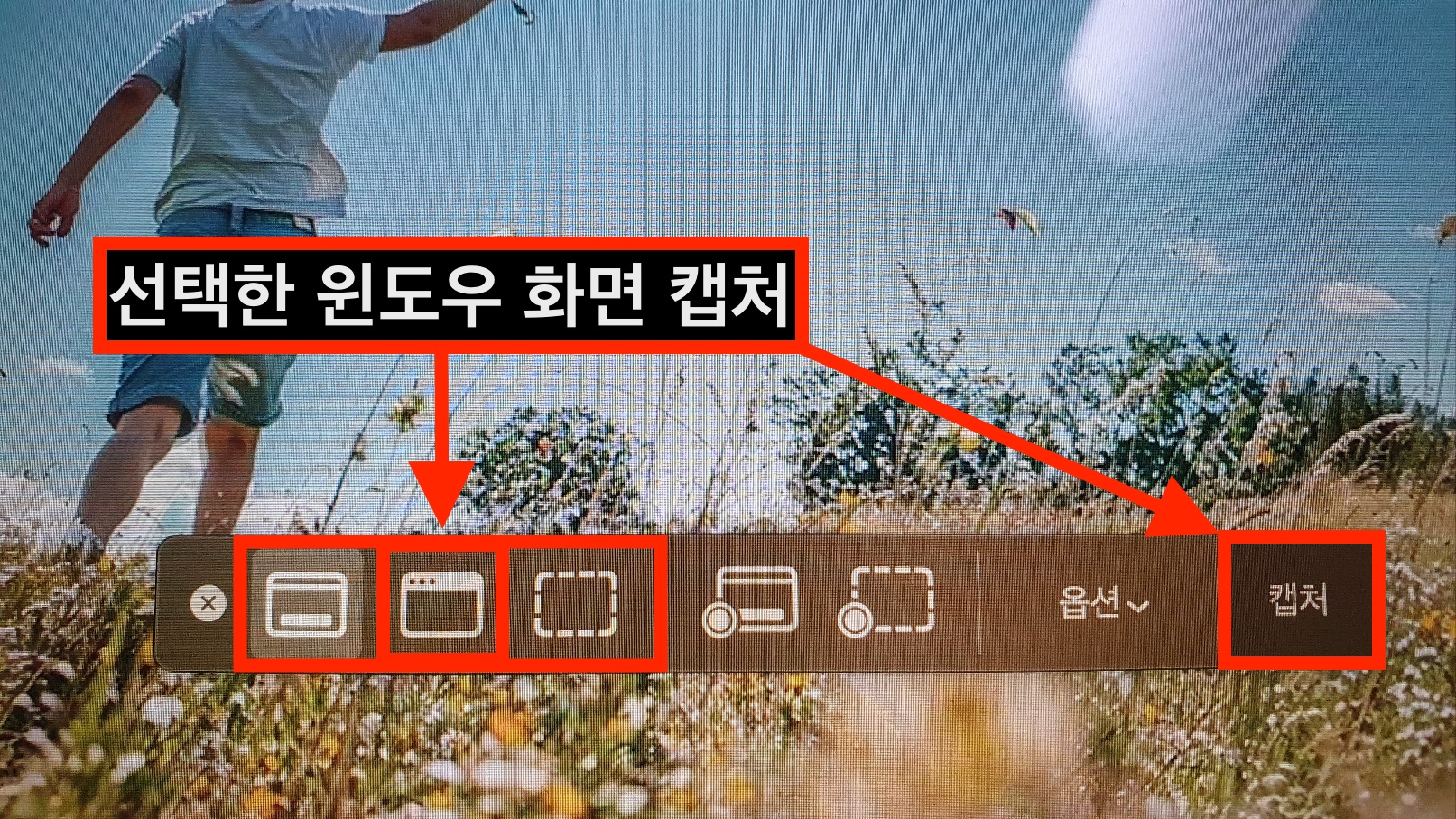 선택 부분 캡처를 이용하면 아래의 화면처럼 캡처가 진행됩니다. 예시로 이미지 속 아이가 날리고 있는 연을 부분 캡처해 보도록 하겠습니다.